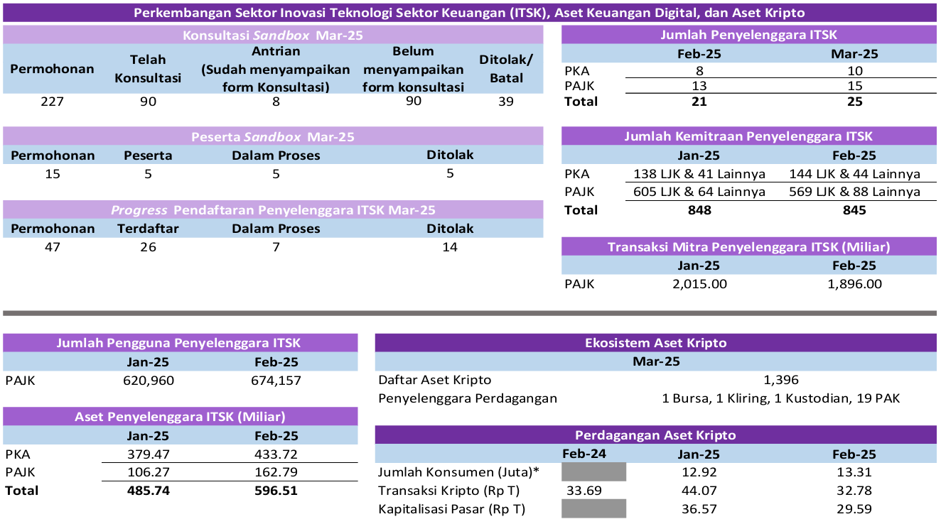 Selain itu, selama Februari 2025, Penyelenggara ITSK dengan jenis PAJK berhasil menyelesaikan transaksi yang disetujui mitra senilai Rp1,896 triliun dengan jumlah pengguna PAJK sebanyak 674.157 user yang tersebar di seluruh wilayah Indonesia. Hal ini menunjukkan bahwa kehadiran layanan dari penyelenggara ITSK telah berkontribusi dalam peningkatan kegiatan dan pendalaman pasar di sektor jasa keuangan, serta meningkatkan inklusi pemanfaatan produk dan layanan jasa keuangan.